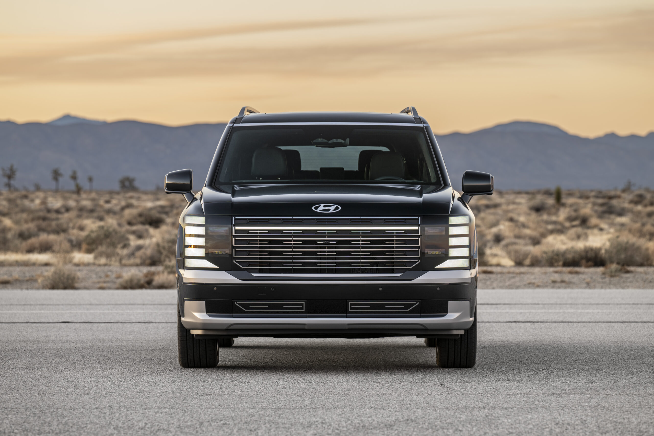 Front three-quarter view at sunset The 2026 Hyundai Palisade Hybrid is shown parked on a desert road. This image highlights the redesigned front fascia, which includes vertical LED daytime running lights and a broad grille. Rear three-quarter driving view This driving shot displays the Palisade Hybrid in motion. The vehicle features a hybrid badge and … Read more
