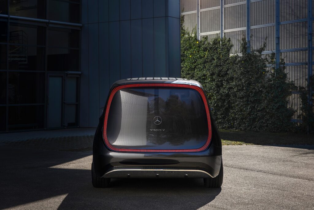 From the rear, the Vision V features a seamless window surface with a wraparound lighting signature made of hundreds of illuminated louvres. The Mercedes-Benz logo and “VISION V” lettering are centered.