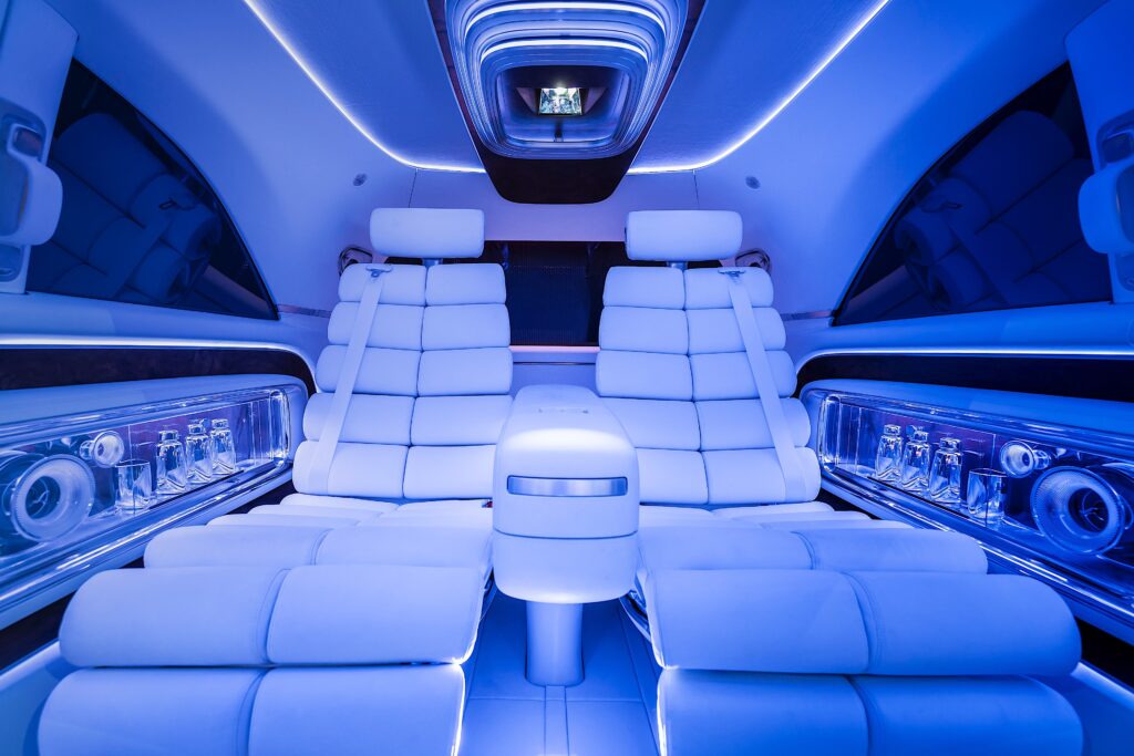 Two rear chairs are shown in a nearly flatbed position. The image captures ambient lighting, storage compartments, and the overall symmetry of the rear cabin.