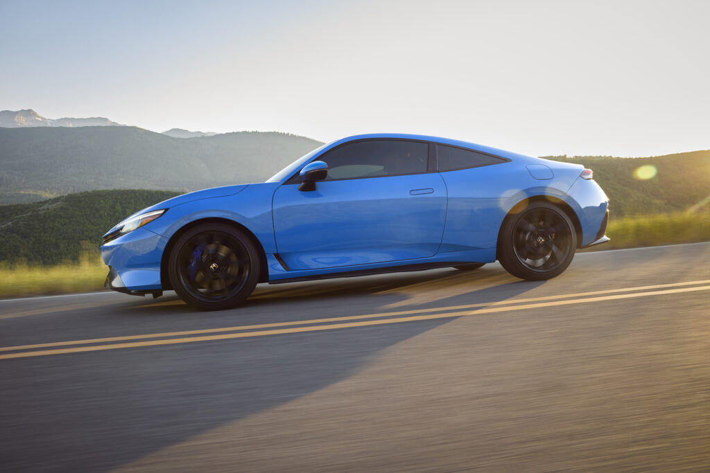 Honda will offer the Prelude in five colors: Winter Frost Pearl, Meteorite Gray Metallic, Crystal Black Pearl, Rally Red, and Boost Blue Pearl, shown here. Buyers can select between body-color or black roof configurations depending on the chosen paint option. The visual profile combines modern design elements with styling cues inspired by earlier Prelude generations, aligning performance with a subtle, refined appearance.