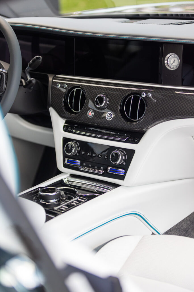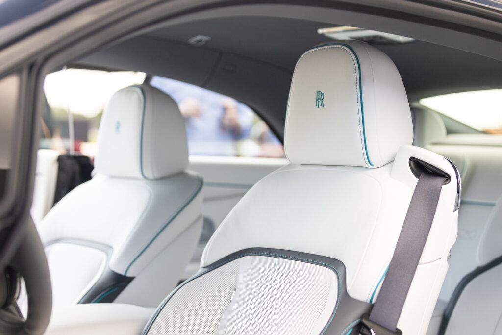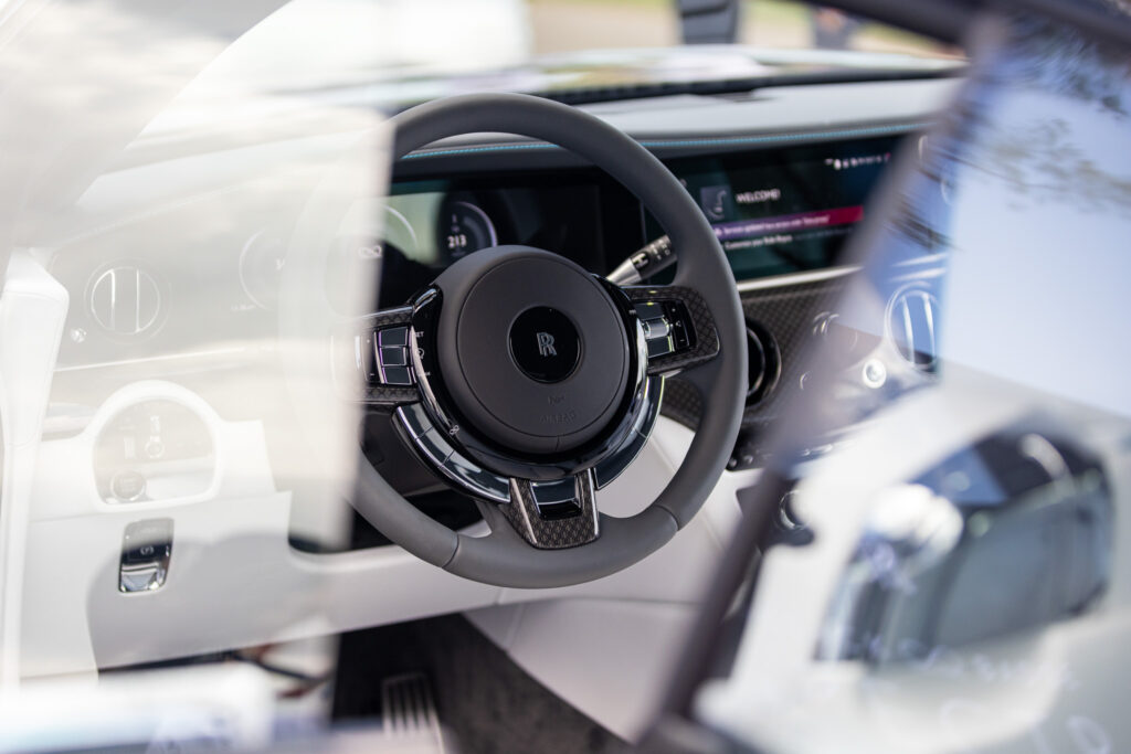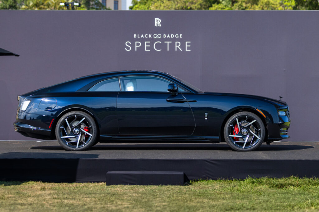 The Black Badge Spectre’s dark aesthetic extends to the grille surround, Spirit of Ecstasy, door handles, and window trim. The noir-inspired accents highlight its presence and create a distinct visual identity