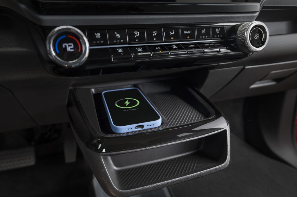 Chevrolet pairs the wireless charger with multiple USB-C ports located throughout the cabin. These ports provide additional power options for devices and passengers in both seating rows. Placement of the wireless charging pad allows easy visibility of the phone’s screen while driving, though Chevrolet recommends limiting interaction to hands-free voice controls for safety.