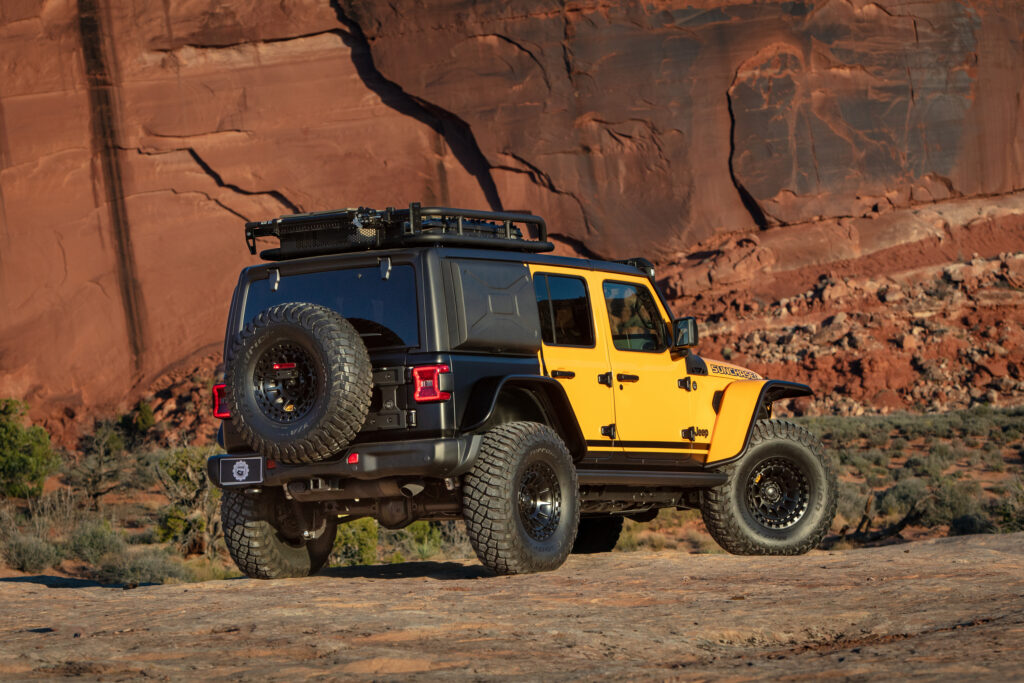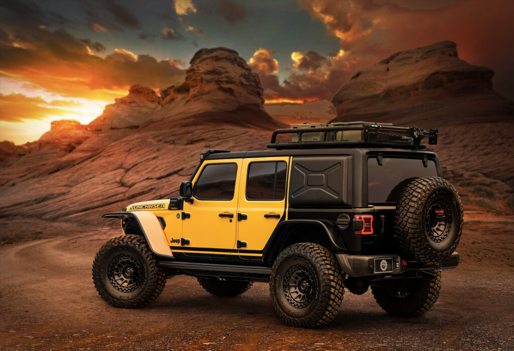 The Jeep Wrangler 4xe Sunchaser Concept is shown parked in front of a rock formation, finished in yellow with black accents and off-road enhancements.
