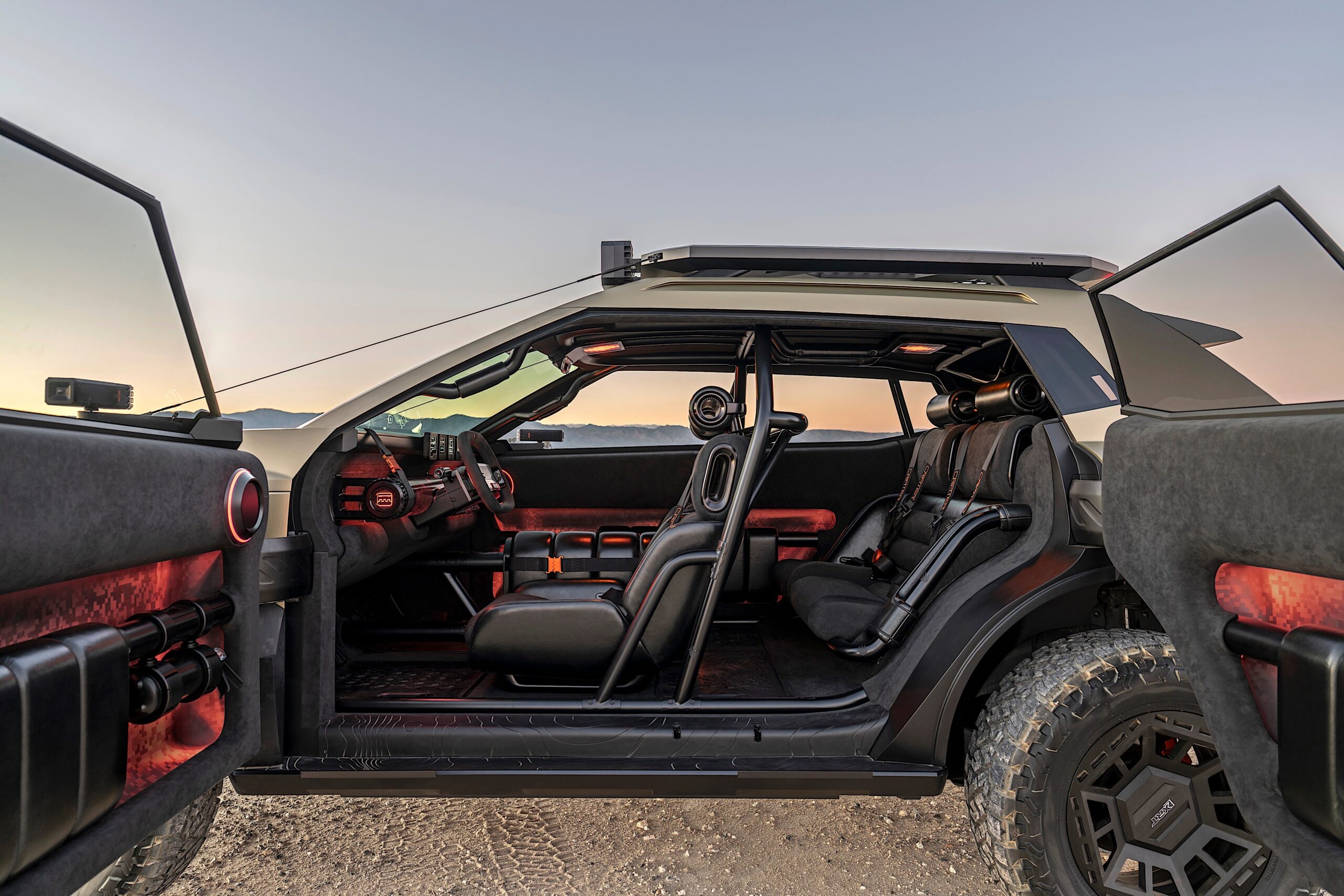 Limb risers, which are tensioned cables connecting the front fenders to the roof, are included to suggest protection from low branches on narrow trails. This is a feature sometimes seen on purpose-built off-road vehicles and helps convey the Crater Concept’s intended use case. The concept also incorporates a sheer fender design meant to emphasize the squared-off, structured appearance of the exterior. Rocker panels are constructed to resemble protective utility cases, reinforcing the vehicle’s stated off-road focus.