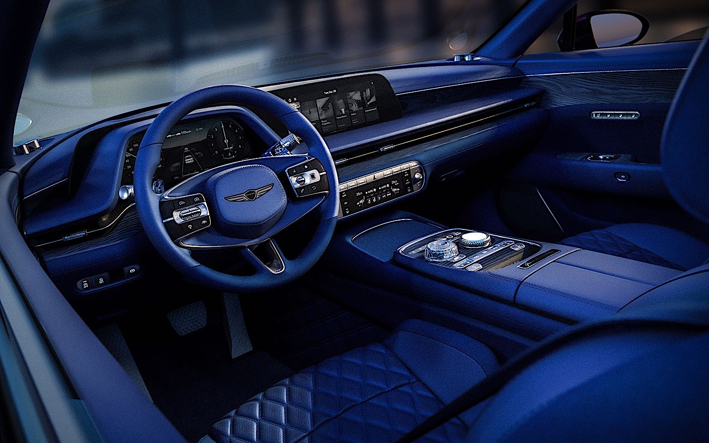 Inside, the concepts feature bespoke materials, ambient lighting, and crystal finishes. The steering wheels incorporate patterned aluminum spokes that coordinate with the rotary controllers. The seats include integrated seat belts and ventilation systems.