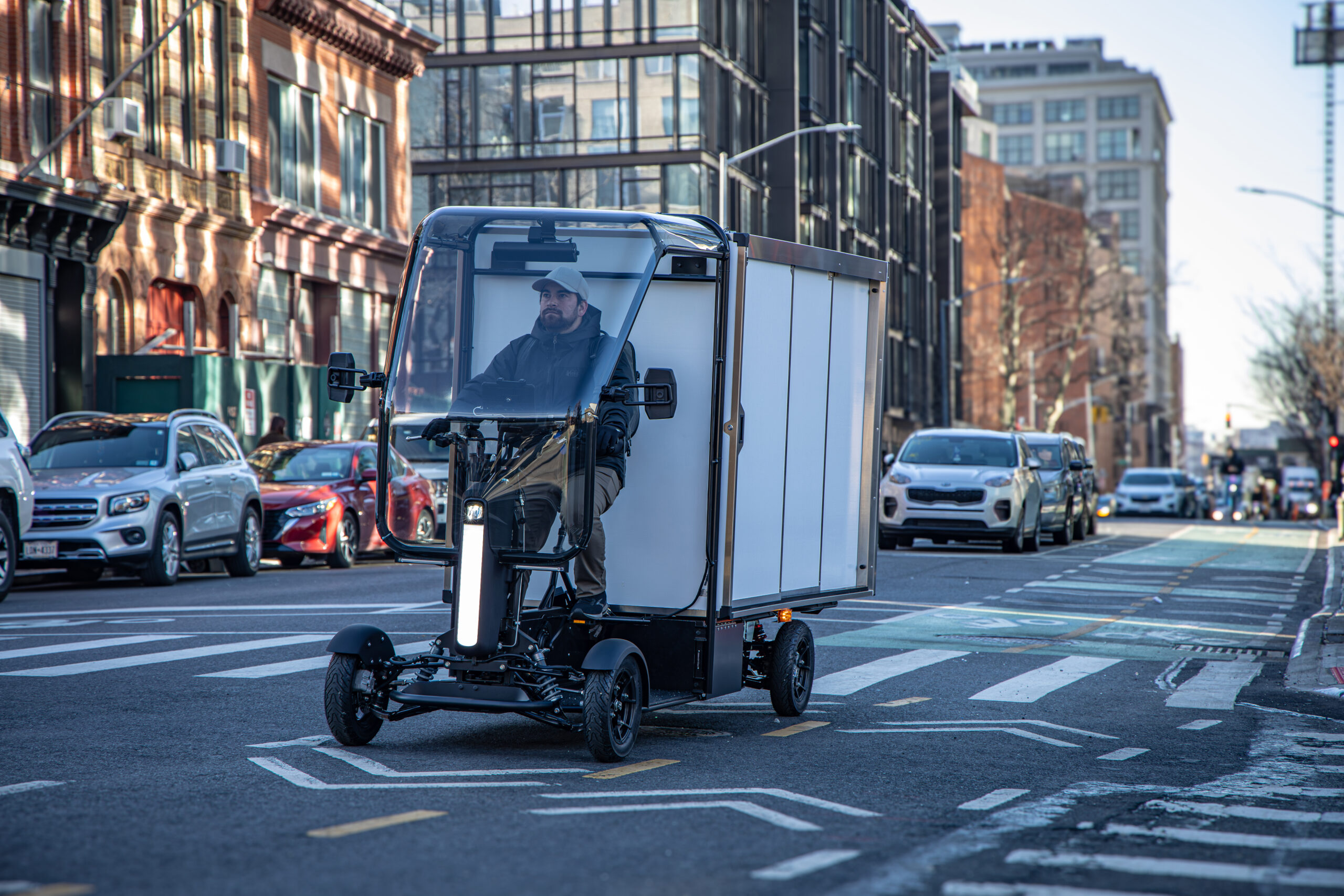 The vehicle has four wheels and an enclosed rider cabin — a meaningful distinction from conventional cargo e-bikes — and is available in two cargo configurations. The larger model is rated for a maximum payload of 650 pounds and achieves a range of up to 23 miles when fully loaded. The smaller configuration handles payloads up to 320 pounds, with range figures still being finalized at the time of reporting. Both variants are governed to a maximum speed of 12 mph, in line with Class 1 pedal-assist regulations.