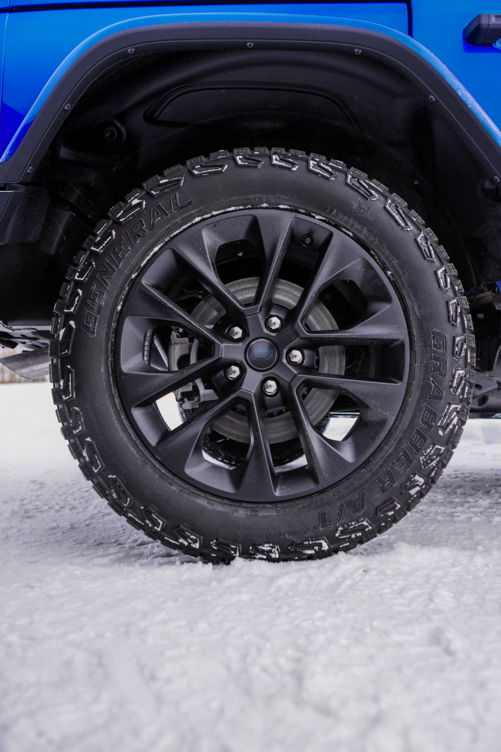 The Wrangler 4xe Backcountry includes new features such as front and rear steel bumpers, rock rails, and a Mopar single-loop grille guard. It is equipped with 275/55R20 General Grabber all-terrain tires mounted on unique 20-inch wheels. The vehicle also features exclusive Backcountry decals on the hood, fenders, and rear swing gate.