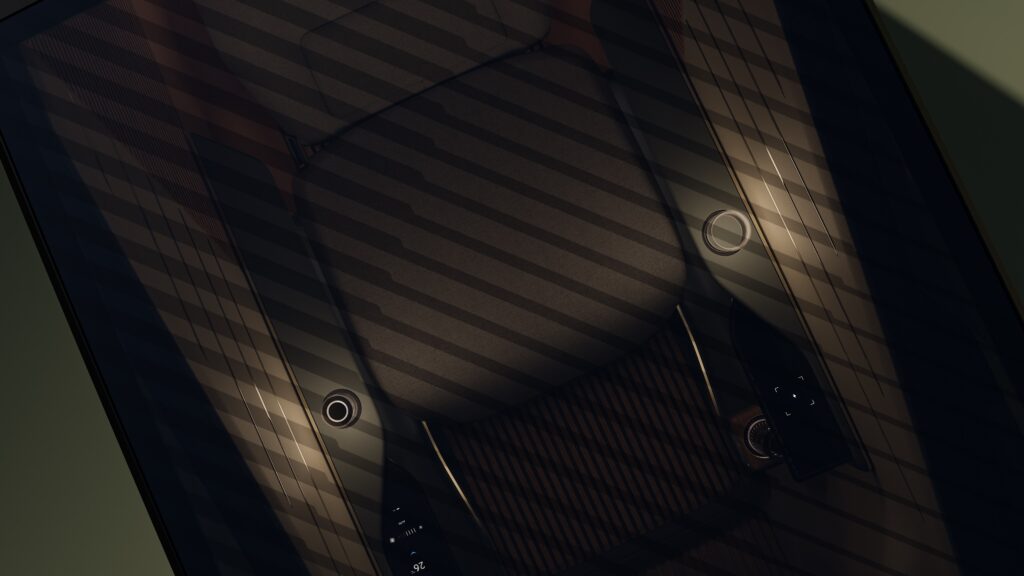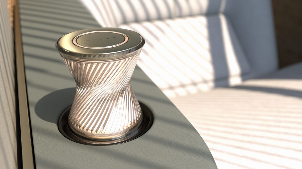 Lexus uses tinted, slatted windows and layered materials to control visibility and light inside the pod. This enhances privacy for the occupant while filtering ambient light to maintain a calm interior atmosphere.