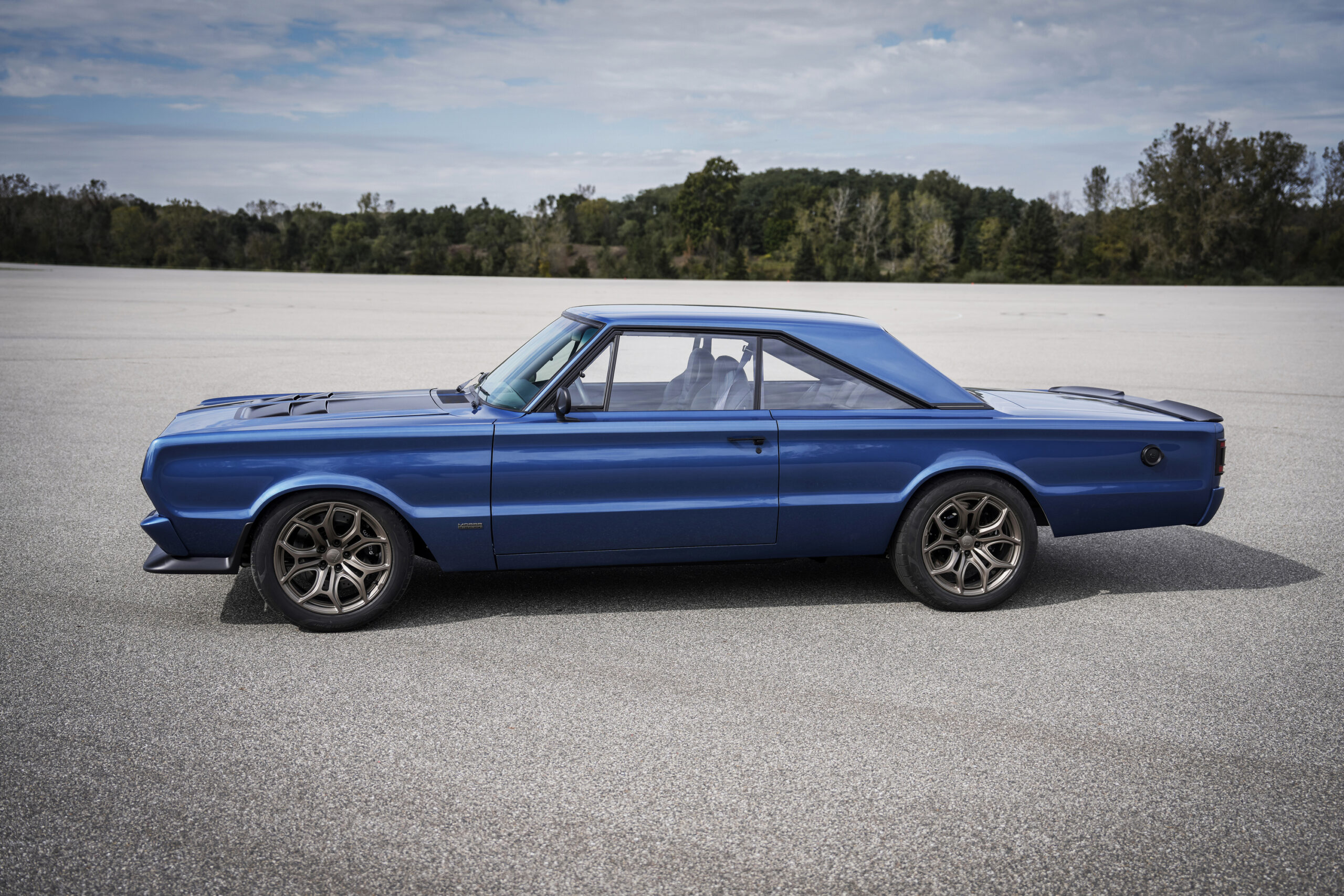 The concept includes a modified carbon-fiber front splitter, rear spoiler, and a classic flip-top fuel cap, reimagined to serve as a charging port. It sits on 18-by-9-inch Vintage Bronze forged magnesium wheels fitted with Pirelli P-ZERO tires. The car’s braking system comprises Wilwood disc brakes on all four wheels. Its electric drive module (EDM) offers approximately 335 horsepower and is mounted with custom aluminum motor mounts. The vehicle is estimated to have a range of 250 miles.