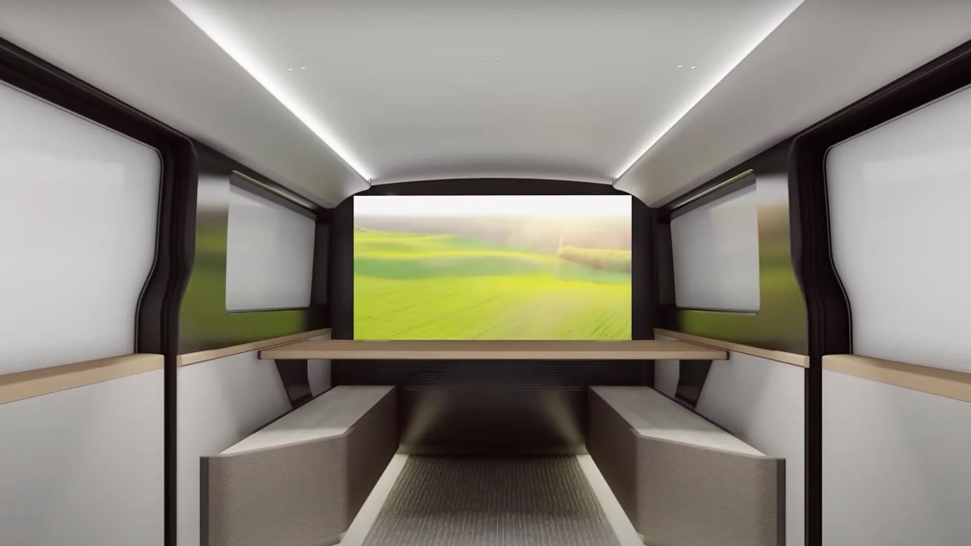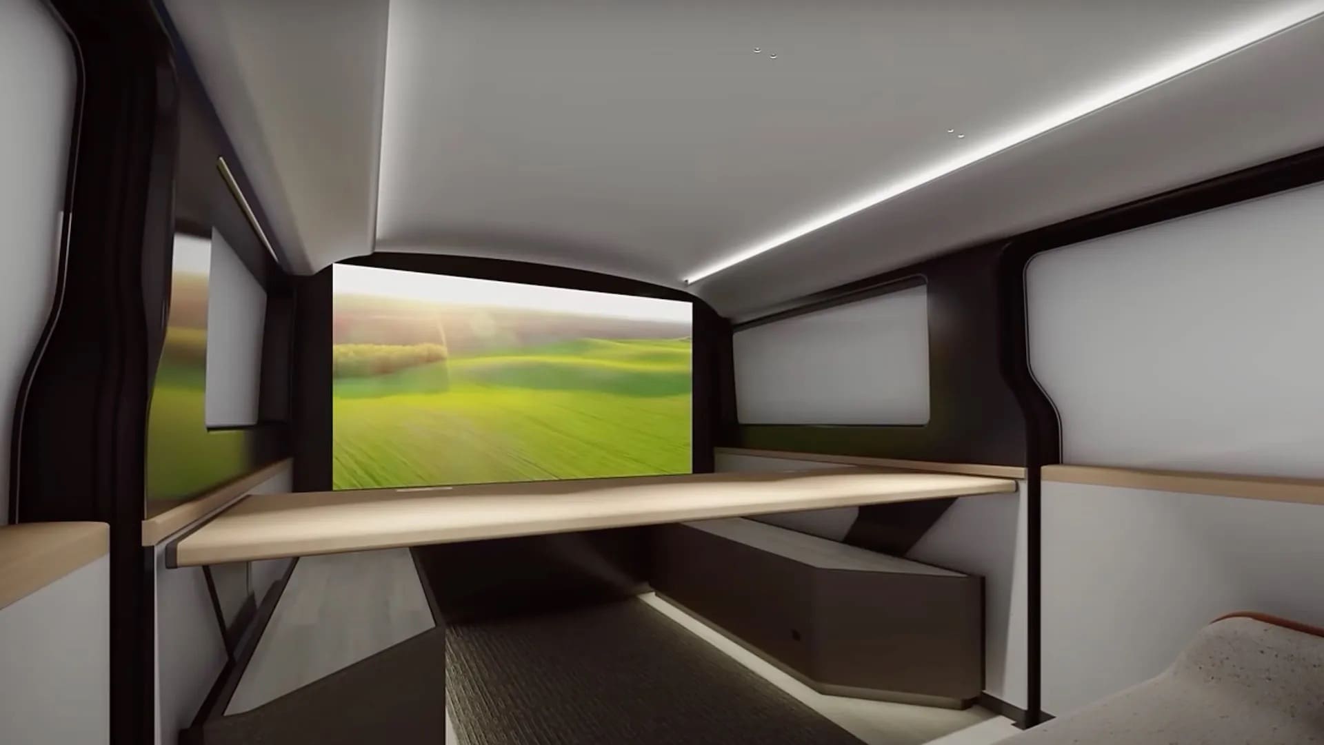 The rear of the vehicle is equipped with a 65V display that serves multiple functions. It can act as an immersive theater room, a children’s play area, or a dedicated space for remote work. This display allows for seamless communication with family members at home, functioning as though they are in the next room.