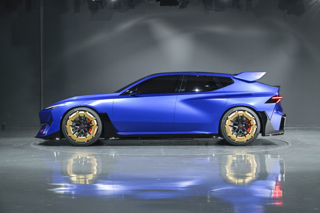 The gold wheels are a deliberate callback to Subaru’s rally heritage, where gold multi-spokes became synonymous with STI’s performance identity. Here, they appear larger, flatter, and more aerodynamic.