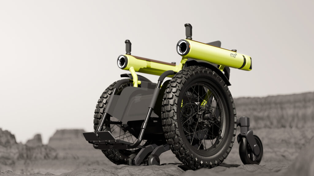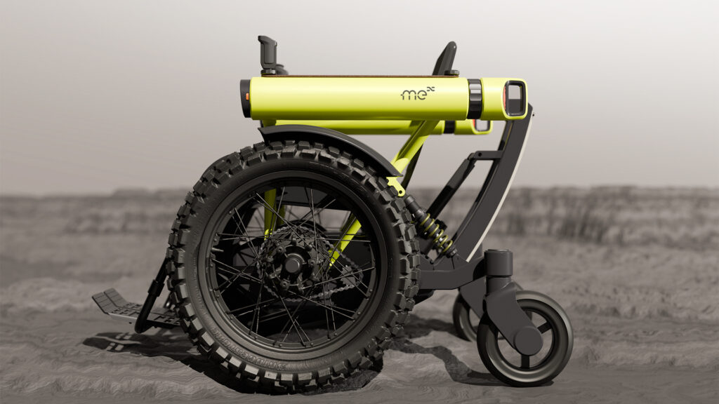 Built to handle trails, gravel, and mud, the Challenge Me pairs a compact electric drive with a high-clearance chassis. In this rendering, it’s shown ascending a dirt slope, emphasizing its ability to keep users mobile in environments where conventional wheelchairs would struggle. The design reflects Toyota’s theme of “Mobility for All,” applied to real-world adventure settings.