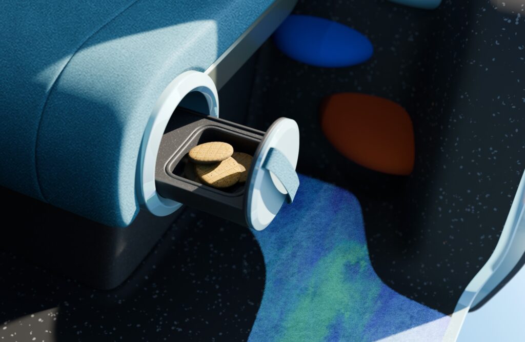 The interior combines soft textures with color-coded materials that guide use. Bright hues highlight touchpoints such as handles, seat bases, and switches, while the darker lower sections resist scuffing and wear.