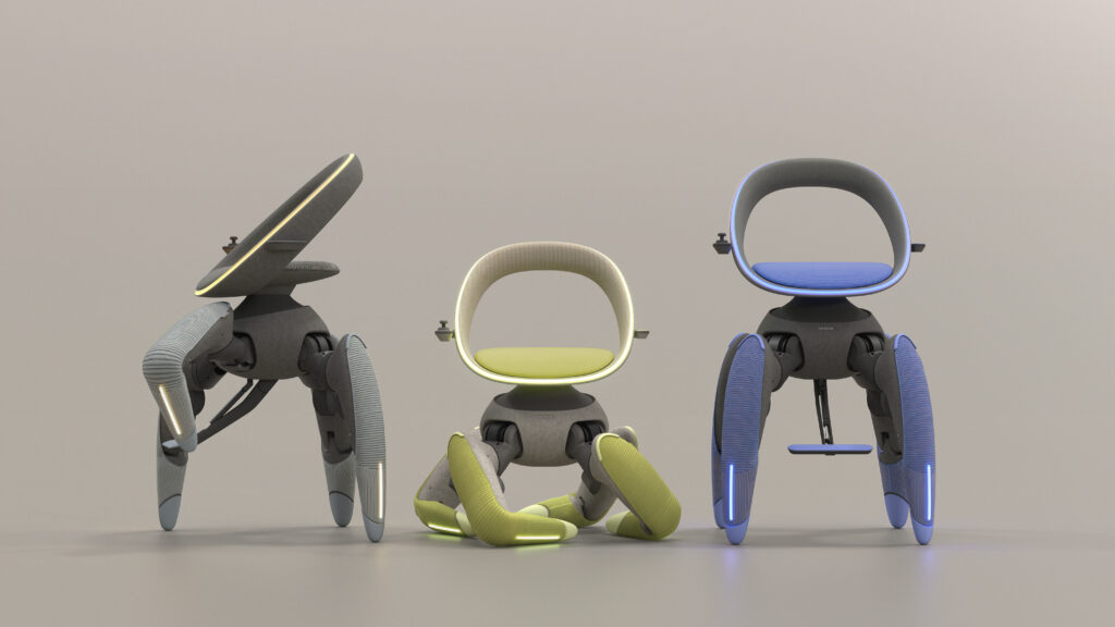 Toyota previewed several versions of the Walk Me concept, with color-coded lighting and accents suggesting different user profiles or activity modes. Each retains the same rounded seating structure and four-leg base, underscoring the modular nature of the design.